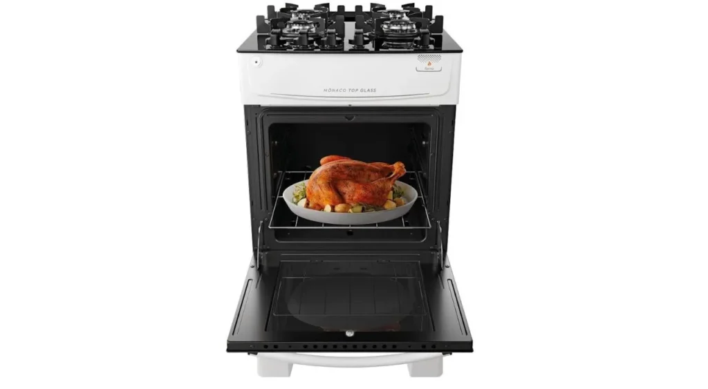 A porta do forno tem vidro duplo. Isso é importante porque o calor fica mais retido dentro do forno, cozinhando os alimentos de forma mais eficiente e sem desperdiçar tanto gás. Além disso, a parte externa da porta fica menos quente, o que reduz o risco de queimaduras acidentais.